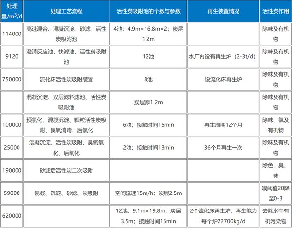 法國南希市水廠,處理能力10萬m3/d,采用0.9~1.0mm的顆?;钚蕴看嫔疤繉雍?.5m,主要用于去除水中的臭和味。美國西弗吉尼亞洲尼特羅水廠,處理能力2.66萬m3/d,采用單池面積72.3m2的顆?;钚蕴课匠?個,炭層厚1.5m,流速9~10m/h,在氯仿抽提物濃度較高時(約1000μg/L),去除率可達84%~89%。